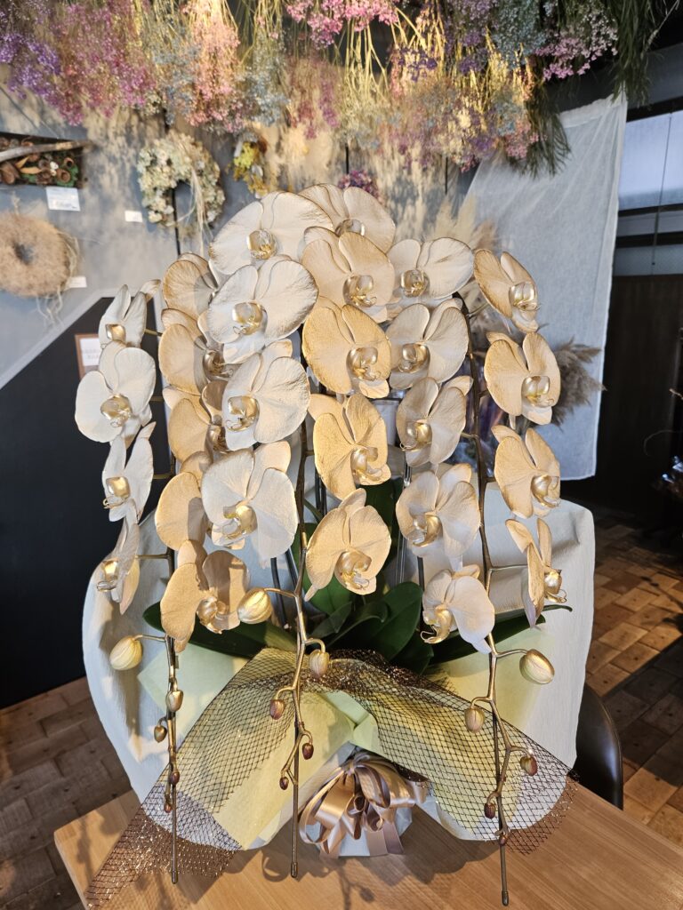 上品な輝きを放つゴールド胡蝶蘭は、特別なシーンをより華やかに演出してくれる一品です。