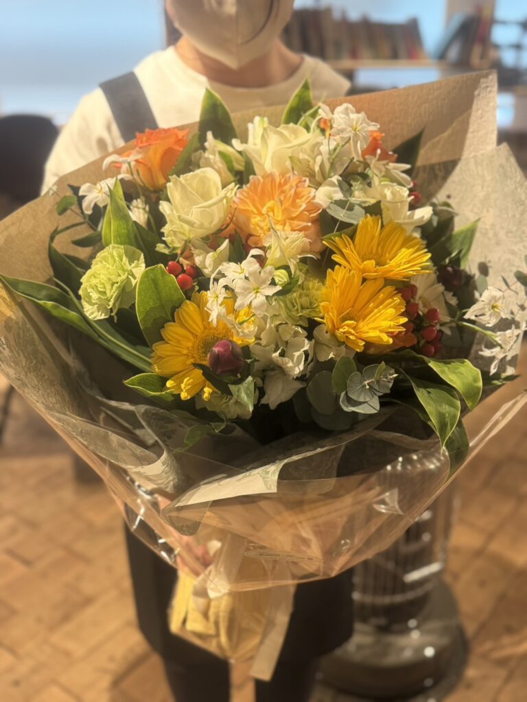 お話を伺いながら、お母さまの雰囲気やお好きな色味をイメージしつつ、明るくあたたかみのある花材で束ねた花束をお渡ししました。