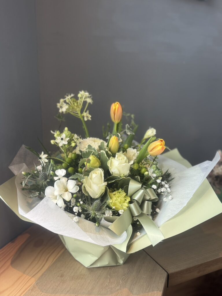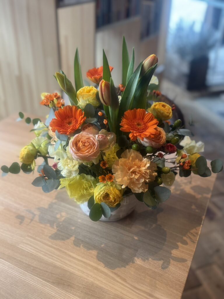 オレンジのチューリップとオレンジガーベラの春のアンティークなアレンジメントです