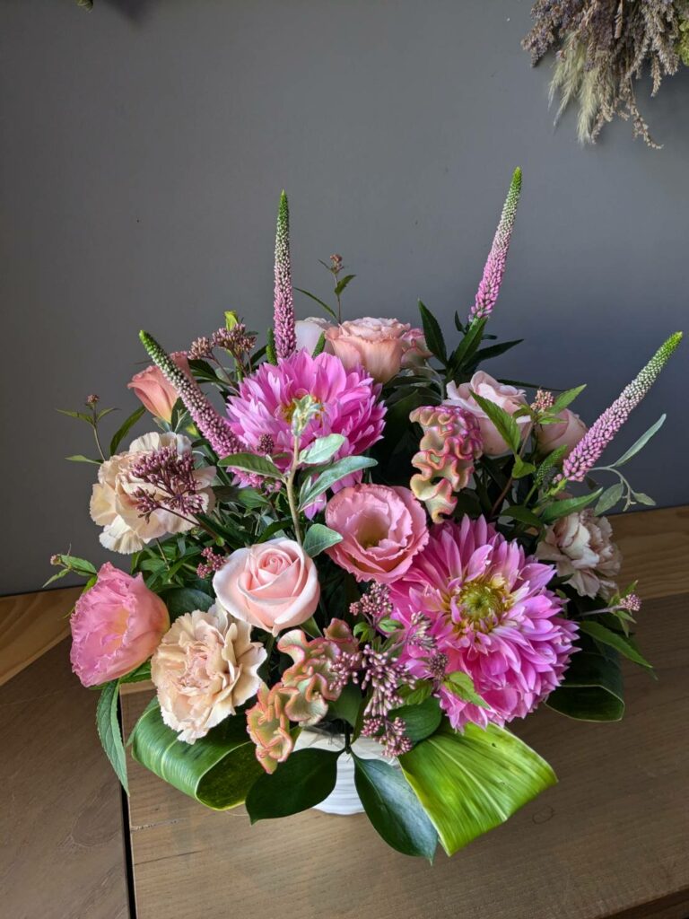 例えば、写真のように優しいピンクを基調にしながらも、ダリアやケイトウ、ベロニカなど異なる表情の花をミックスすることで、動きと立体感のある仕上がりに。