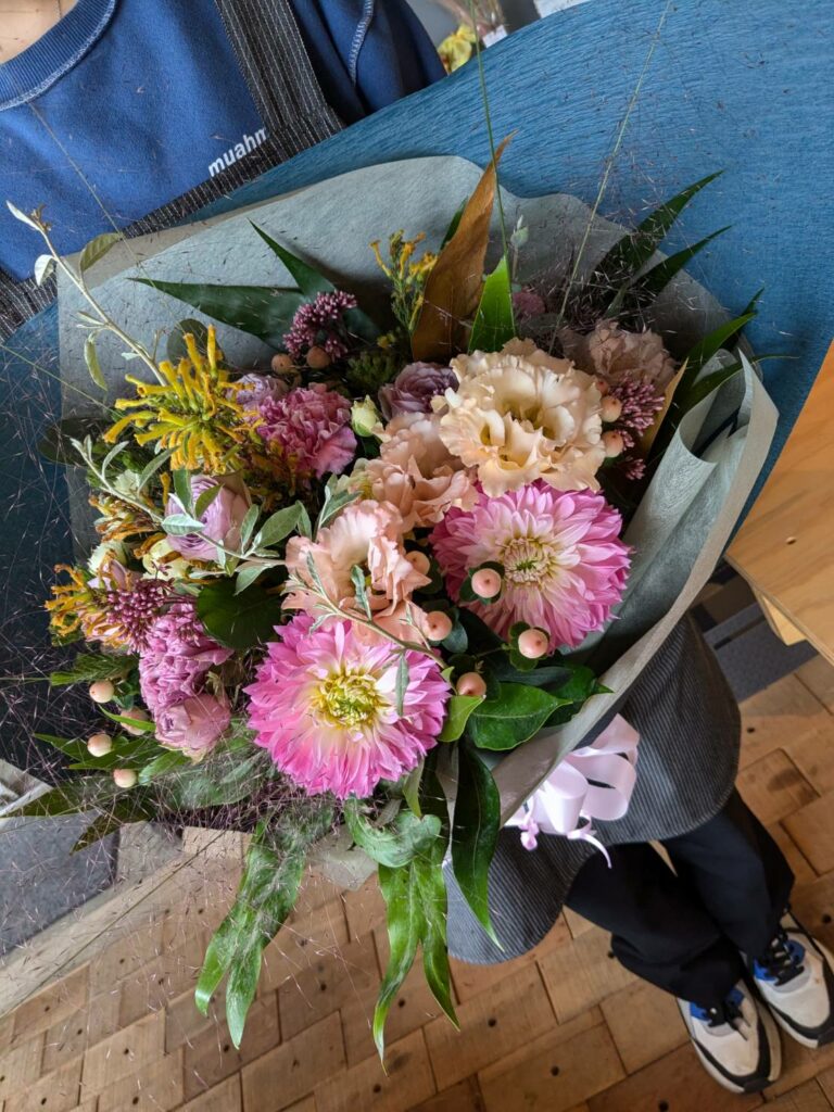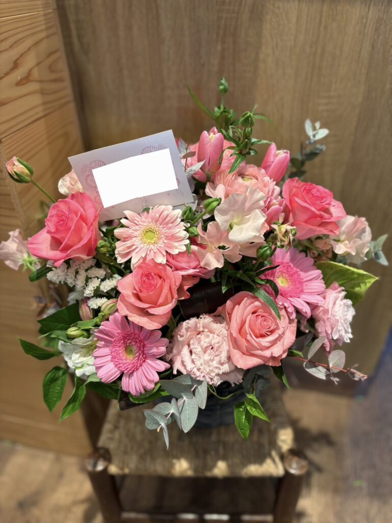 やさしいピンクを基調にした花束は、これまでの歩みをねぎらい、これからの新しい日々をそっと応援してくれるような温かさがあります。