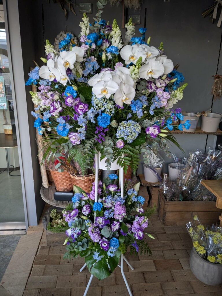 開店祝いや周年祝いなど、特別な節目に贈るスタンド花は「第一印象」を左右する大切な贈り物です。今回ご紹介するのは、爽やかで上品な印象を与える“ブルー”を基調とした御祝スタンド。