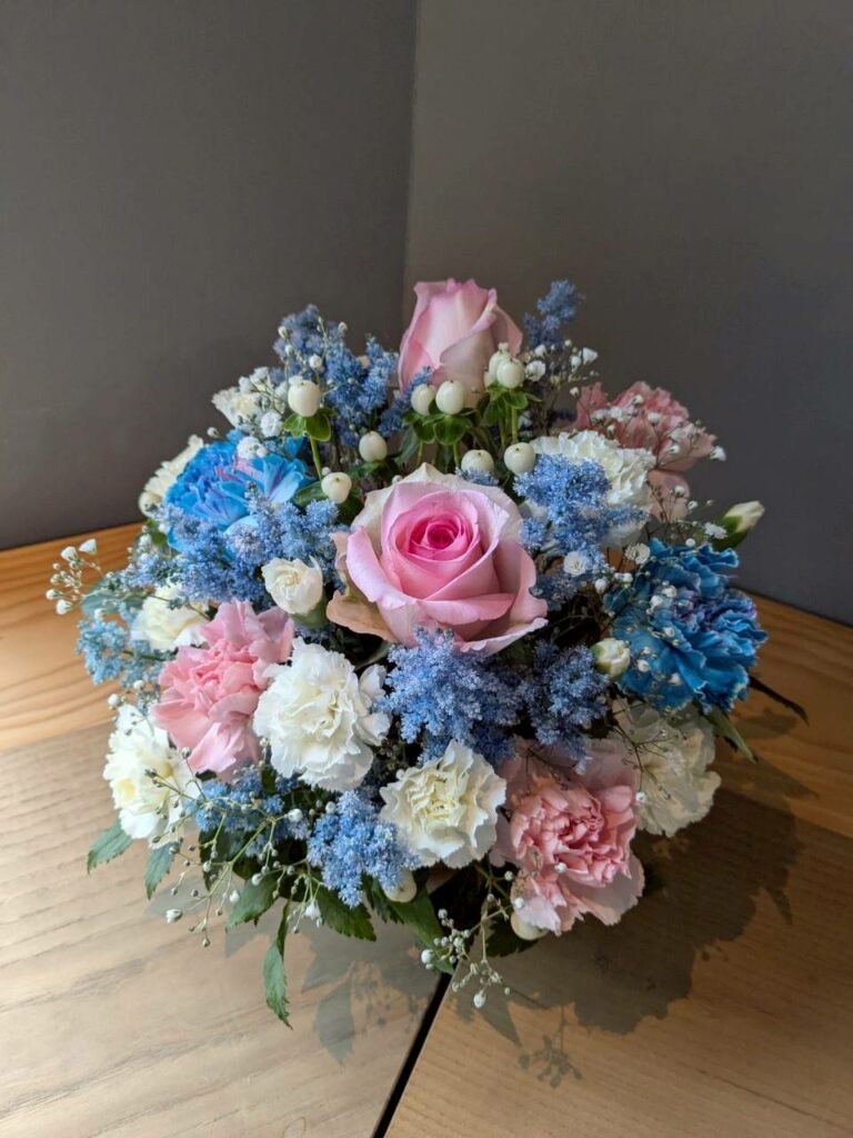 優しいピンクのバラを中心に、ブルーやホワイトの花々を合わせることで、華やかさと落ち着きを両立させました。